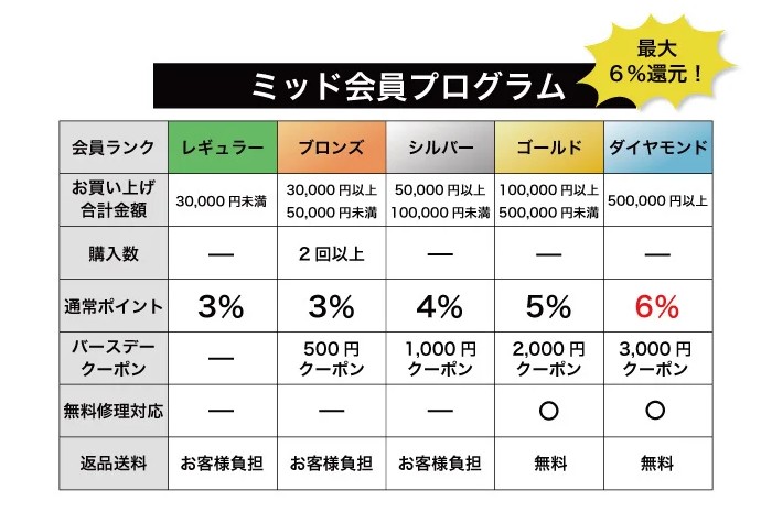 この機会にぜひミッドの会員登録をして、お得な特典と新しい会員ランク制度をお楽しみください。