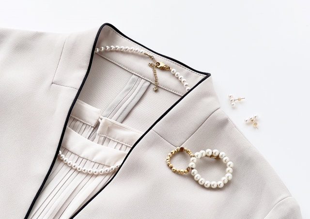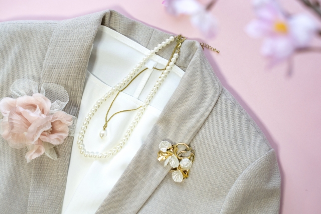 コサージュは、白・クリーム・コーラルピンクなどの明るい色のものを胸元に付けると、顔周りを明るく見せられます。ネックレスやピアスのようなアクセサリーは、パールが定番かつ上品です。大ぶりすぎないシンプルなものを選ぶと、全体がきれいにまとまります。